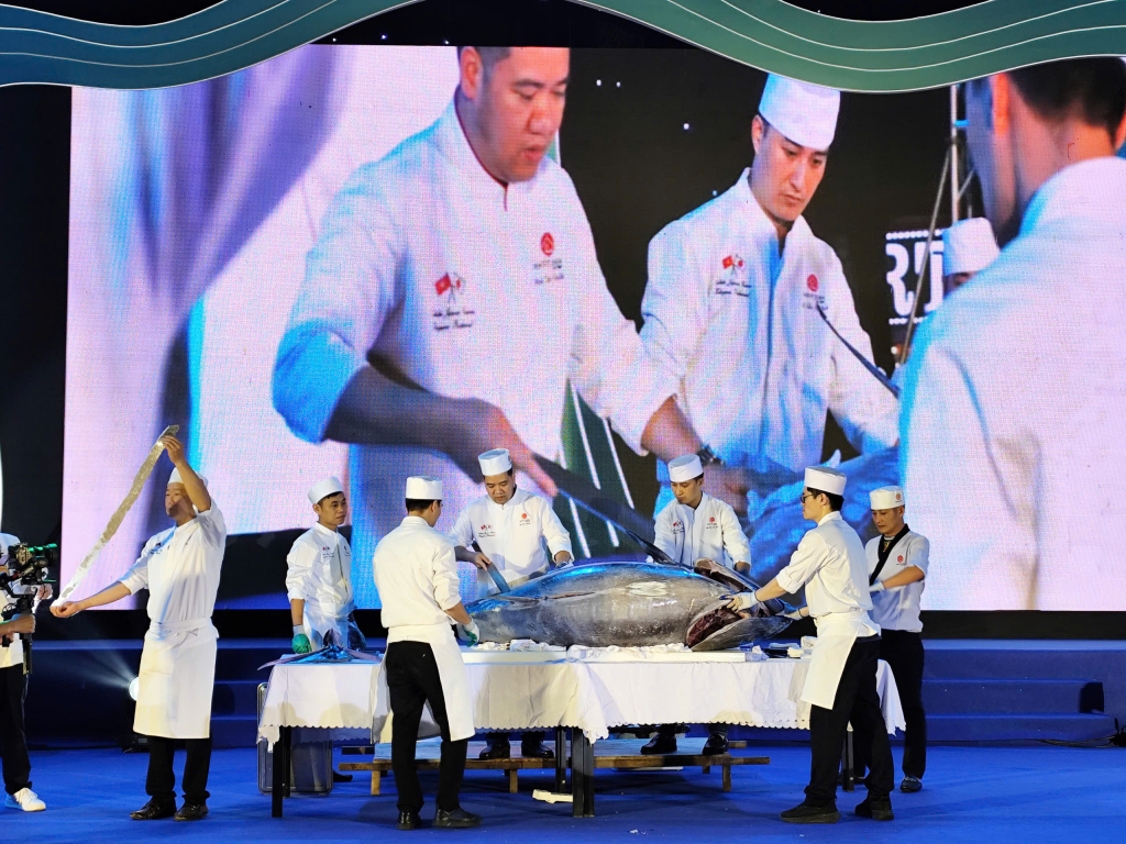 Tâm điểm tại lễ khai mạc Phố ẩm thực quốc tế – Hạ Long 2026 là màn xẻ thịt cá ngừ vây xanh đại dương Nhật Bản nặng 218kg. Màn trình diễn sử dụng thanh kiếm Nhật trị giá 300 triệu đồng để mang trọn tinh hoa đại dương thết đãi thực khách tại Hạ Long.