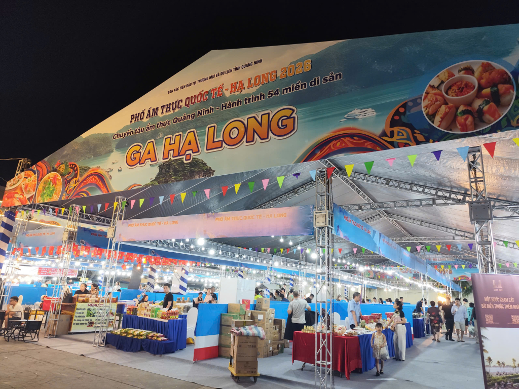 Phố ẩm thực quốc tế – Hạ Long 2026 có quy mô 154 gian hàng, giới thiệu các món ẩm thực đặc sắc và sản phẩm OCOP của các địa phương trong và ngoài tỉnh. Không gian được thiết kế với 54 “toa tàu” ẩm thực đại diện cho 54 xã, phường, đặc khu trong tỉnh.